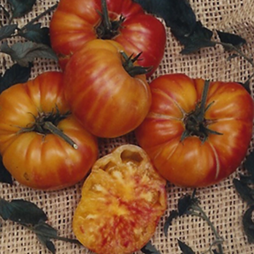 Old German is a long-time favorite. Huge boat-shaped striped Mennonite heirloom tomatoes rich in flavor and perfect for slicing. When ripe, they display a beautiful mottled/striped blend of colors from gold to red. Indeterminate. Packets untreated seed, 10g size organic seed.
